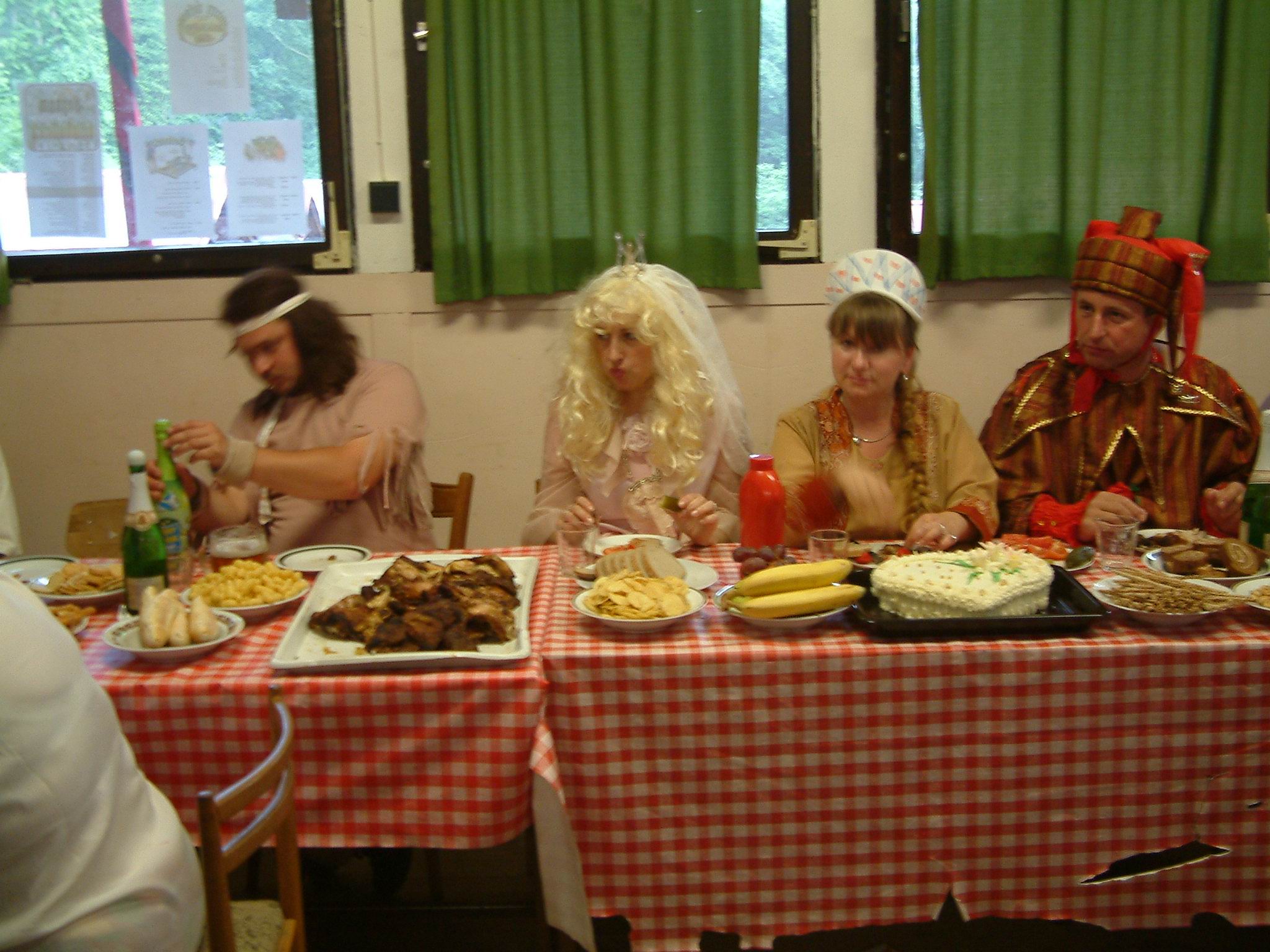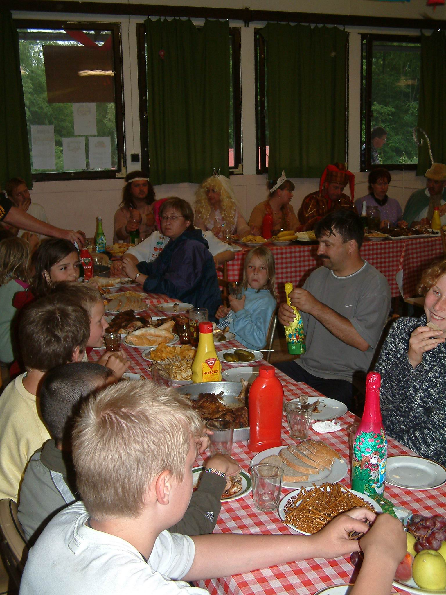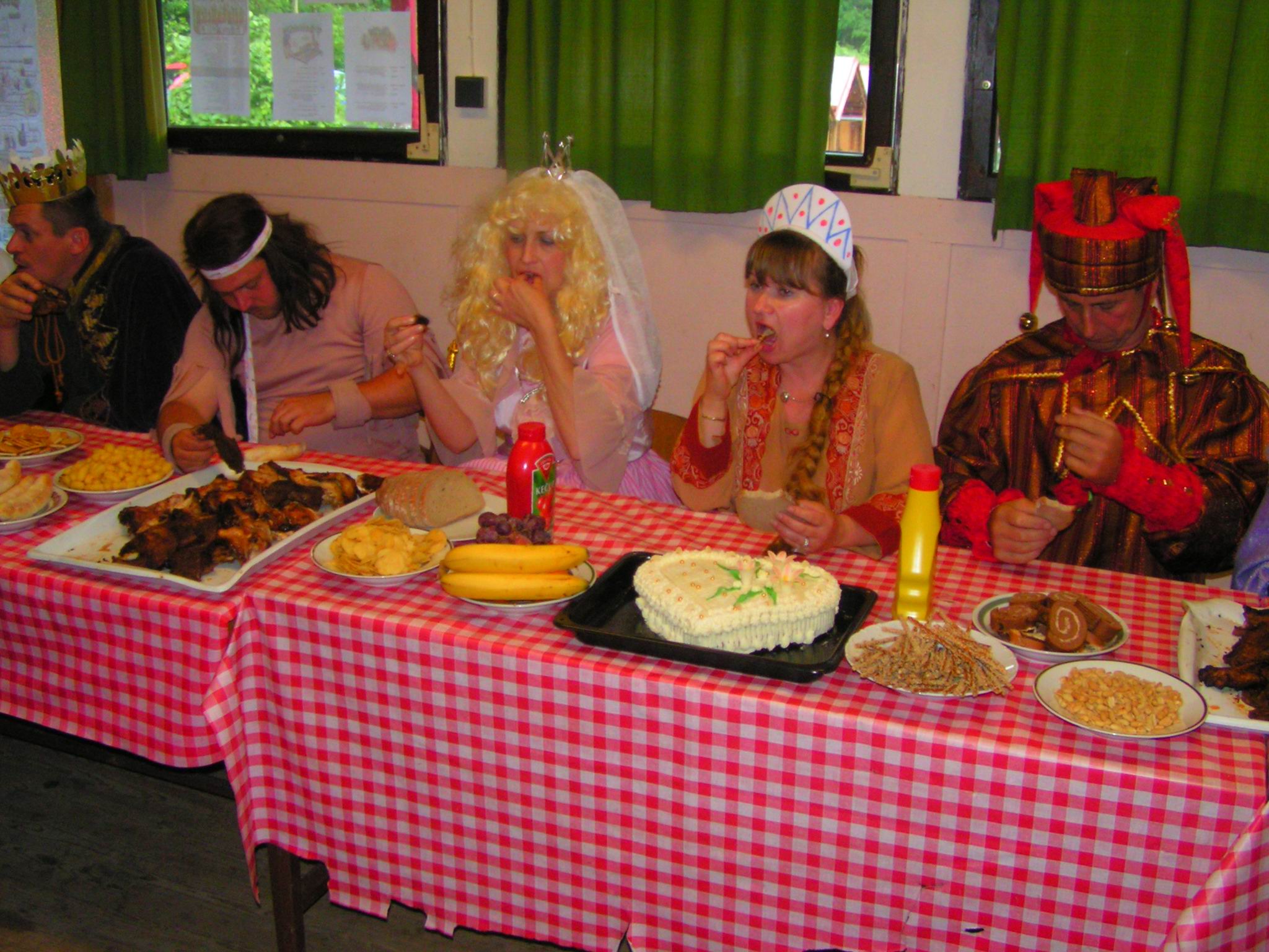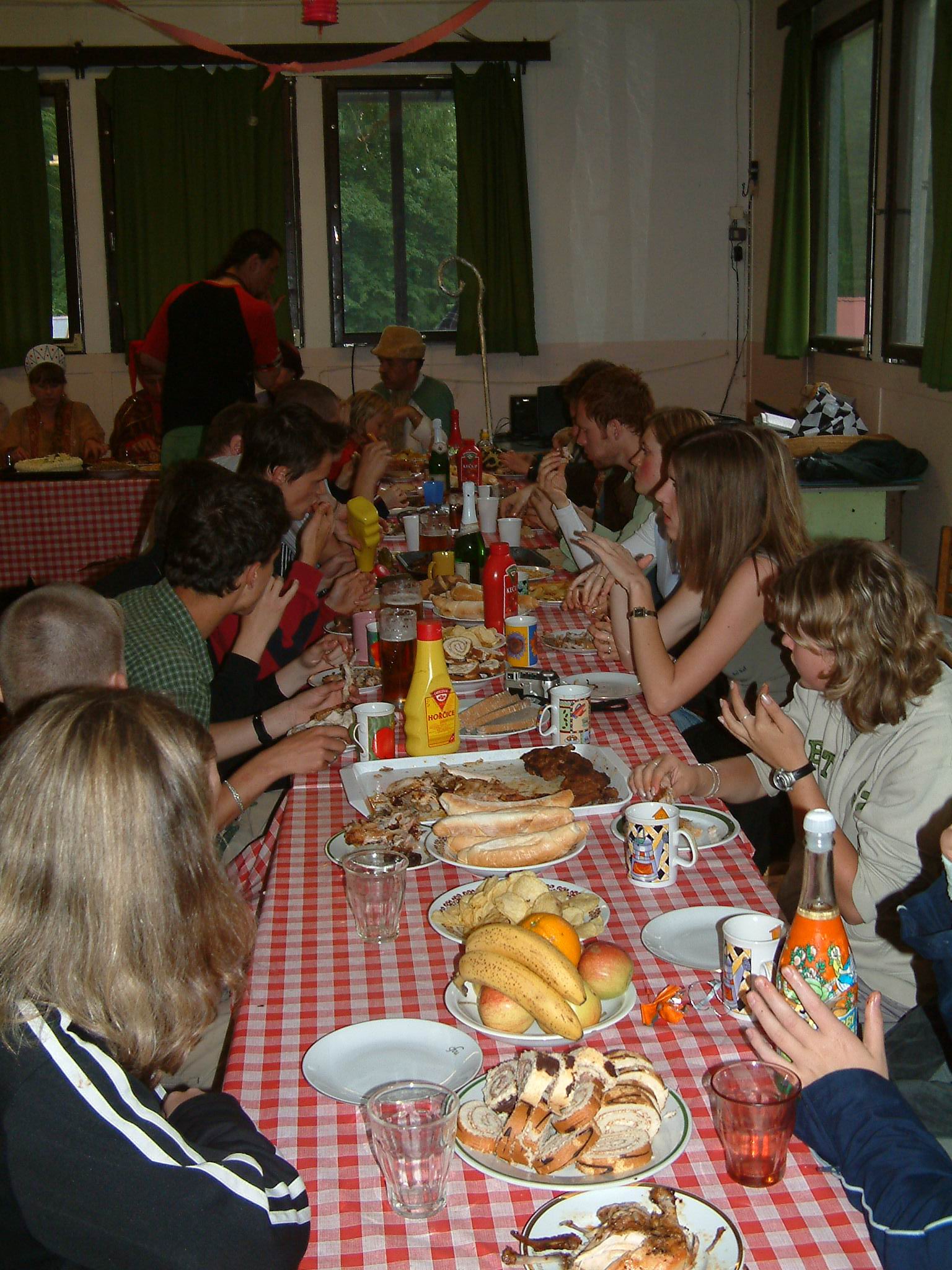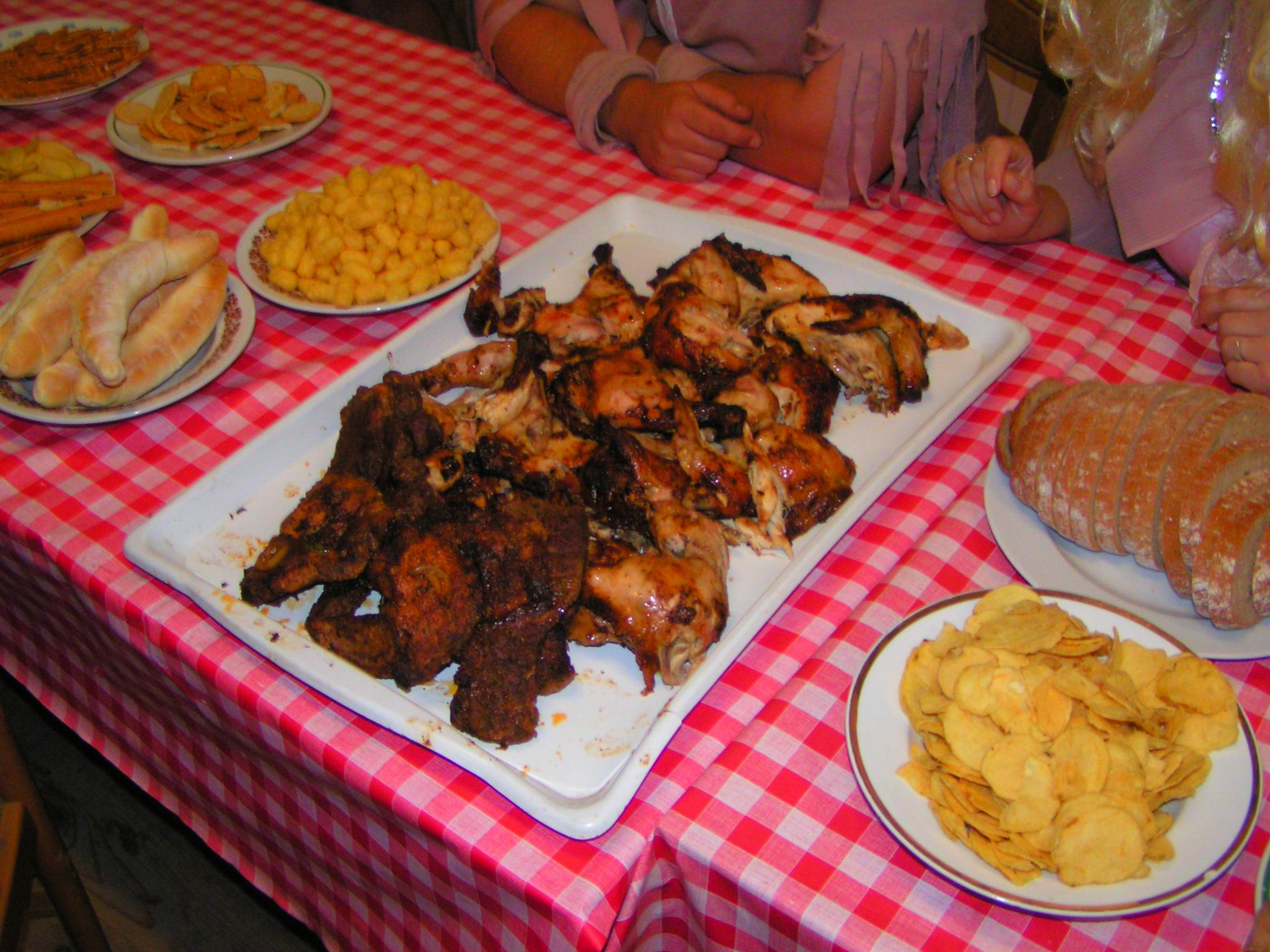 buřty, chléb, hořčice buchty (bábovka), kakao gulášová polévka, játra s rýží uzené vepřové kýty, chléb, hořčice rohlíky se sýrem, čaj polévka (vývar), vepřové, knedlík a zelí svatební hostina kuře a jiné maso na grilu s chlebem, brambůrky, ovoce a zelenina, salát, sušenky, dort a proudy šampaňského chléb s paštikou, čaj špagety s omáčkou doma |