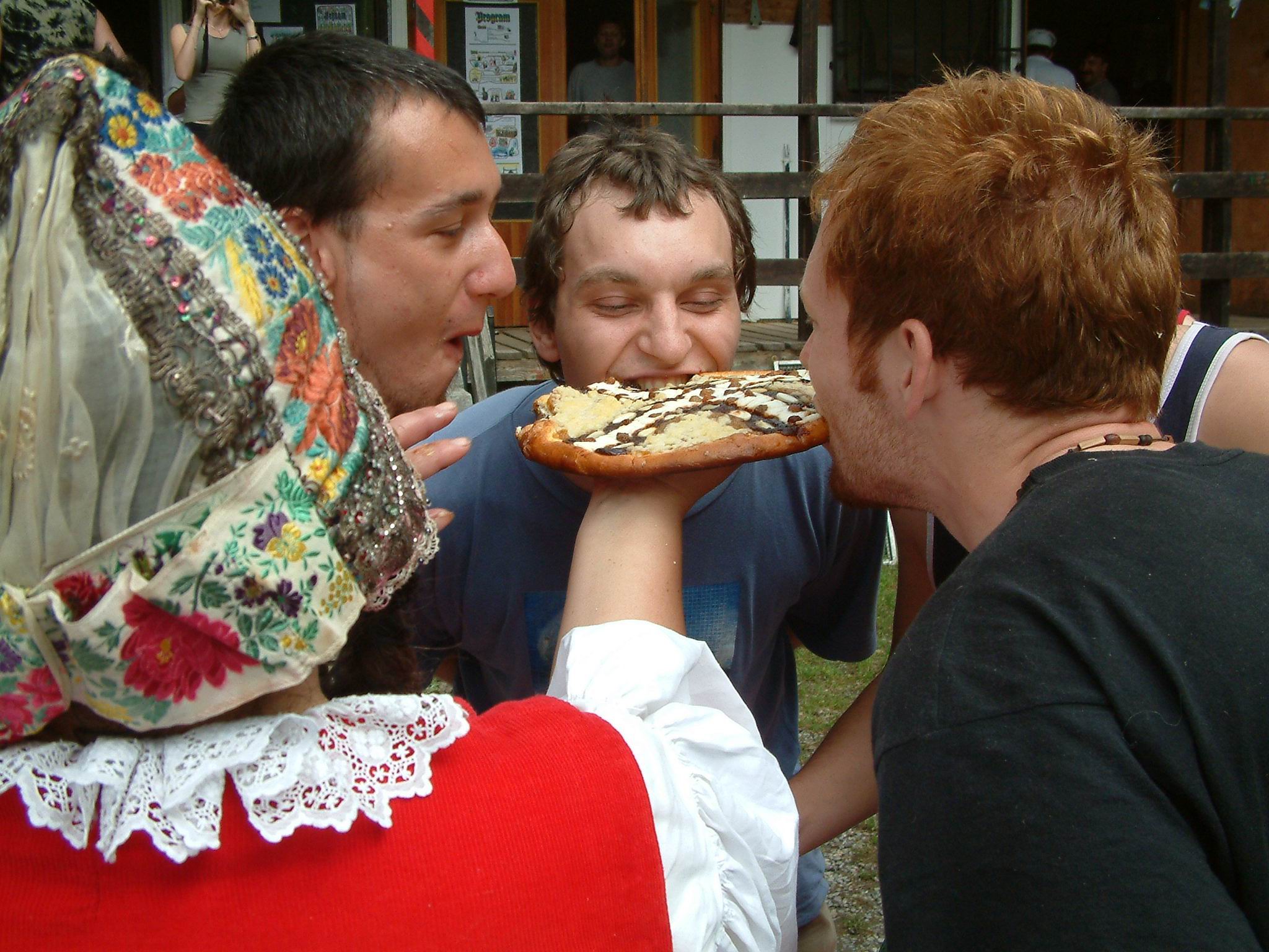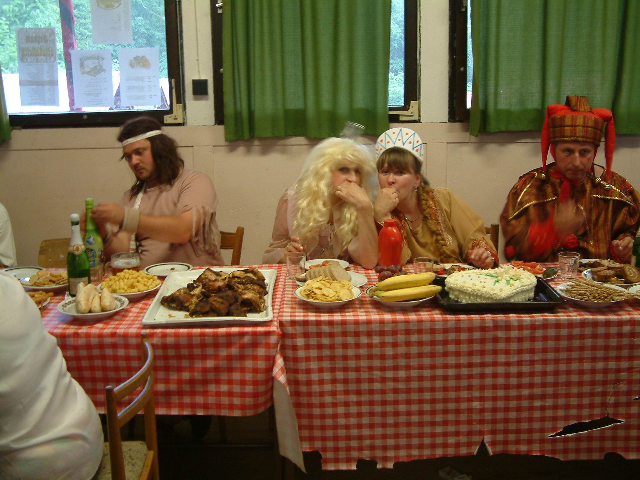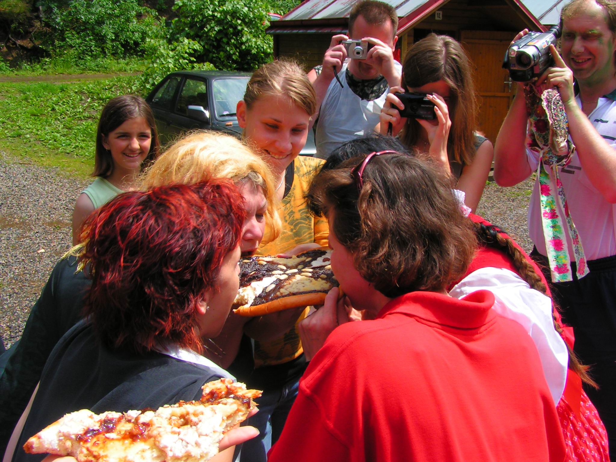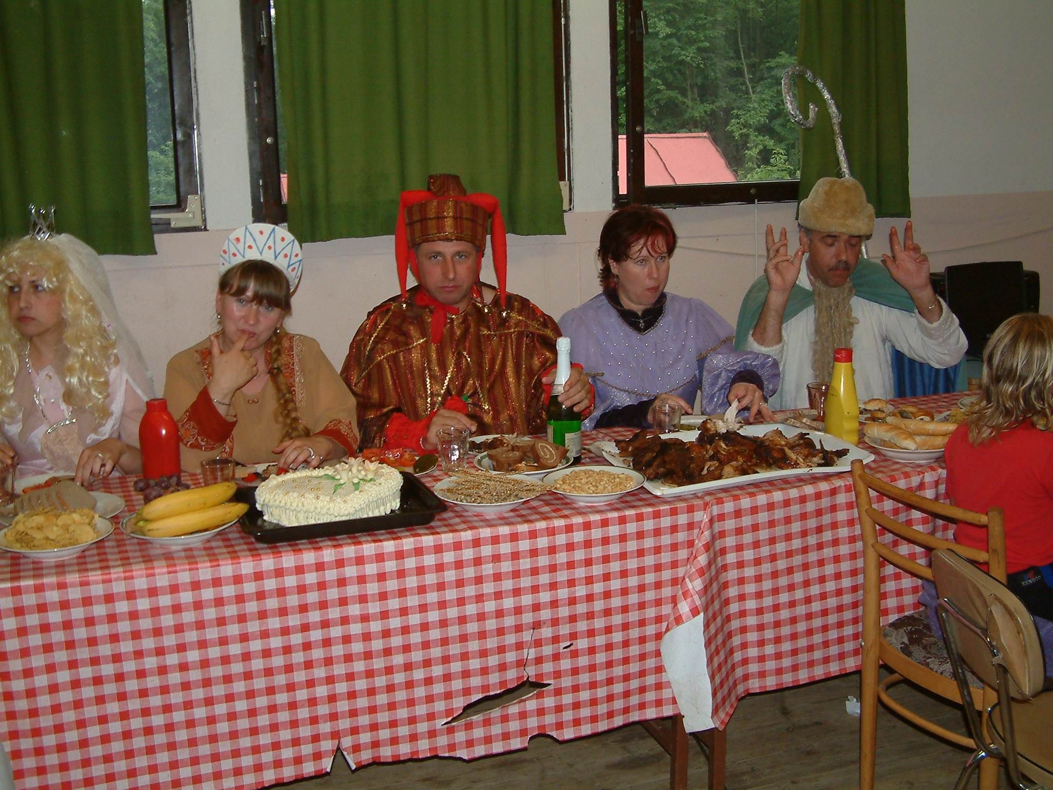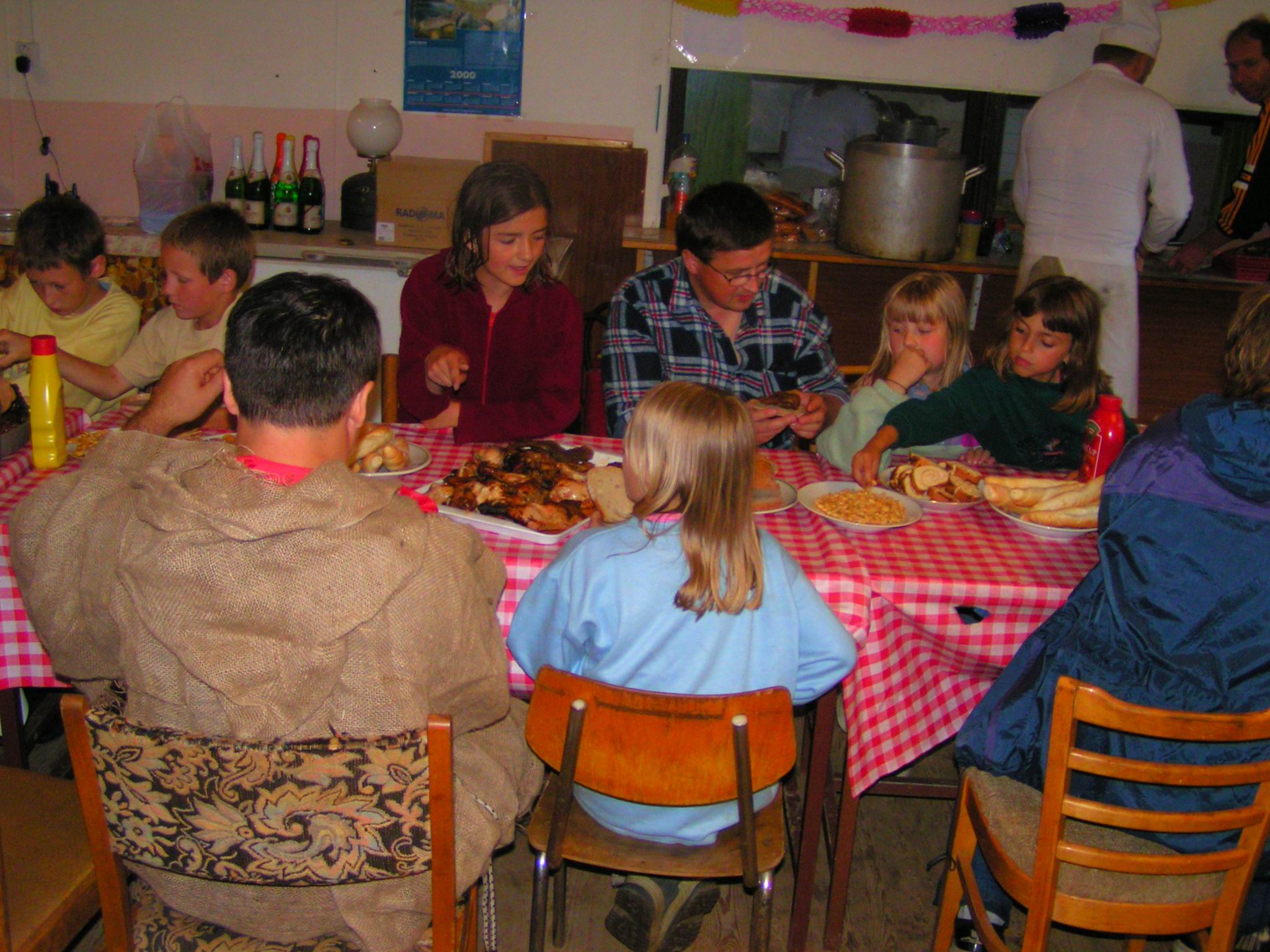 buřty, chléb, hořčice buchty (bábovka), kakao gulášová polévka, játra s rýží uzené vepřové kýty, chléb, hořčice rohlíky se sýrem, čaj polévka (vývar), vepřové, knedlík a zelí svatební hostina kuře a jiné maso na grilu s chlebem, brambůrky, ovoce a zelenina, salát, sušenky, dort a proudy šampaňského chléb s paštikou, čaj špagety s omáčkou doma |