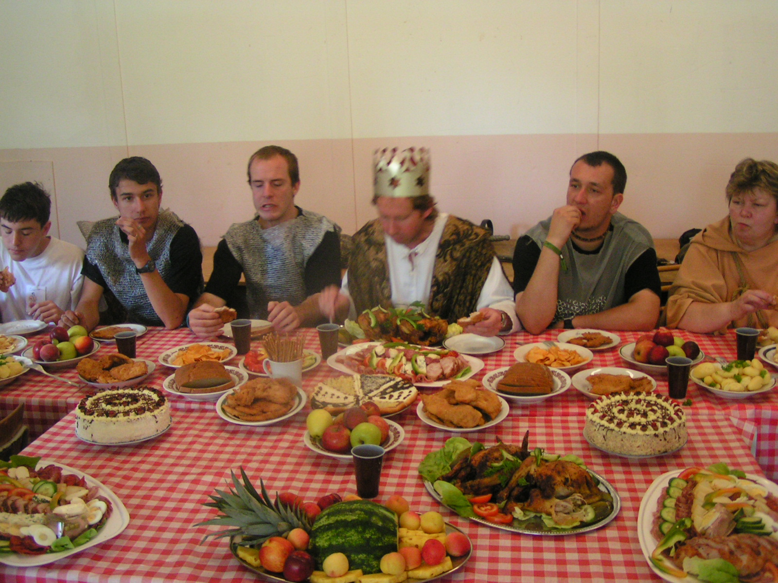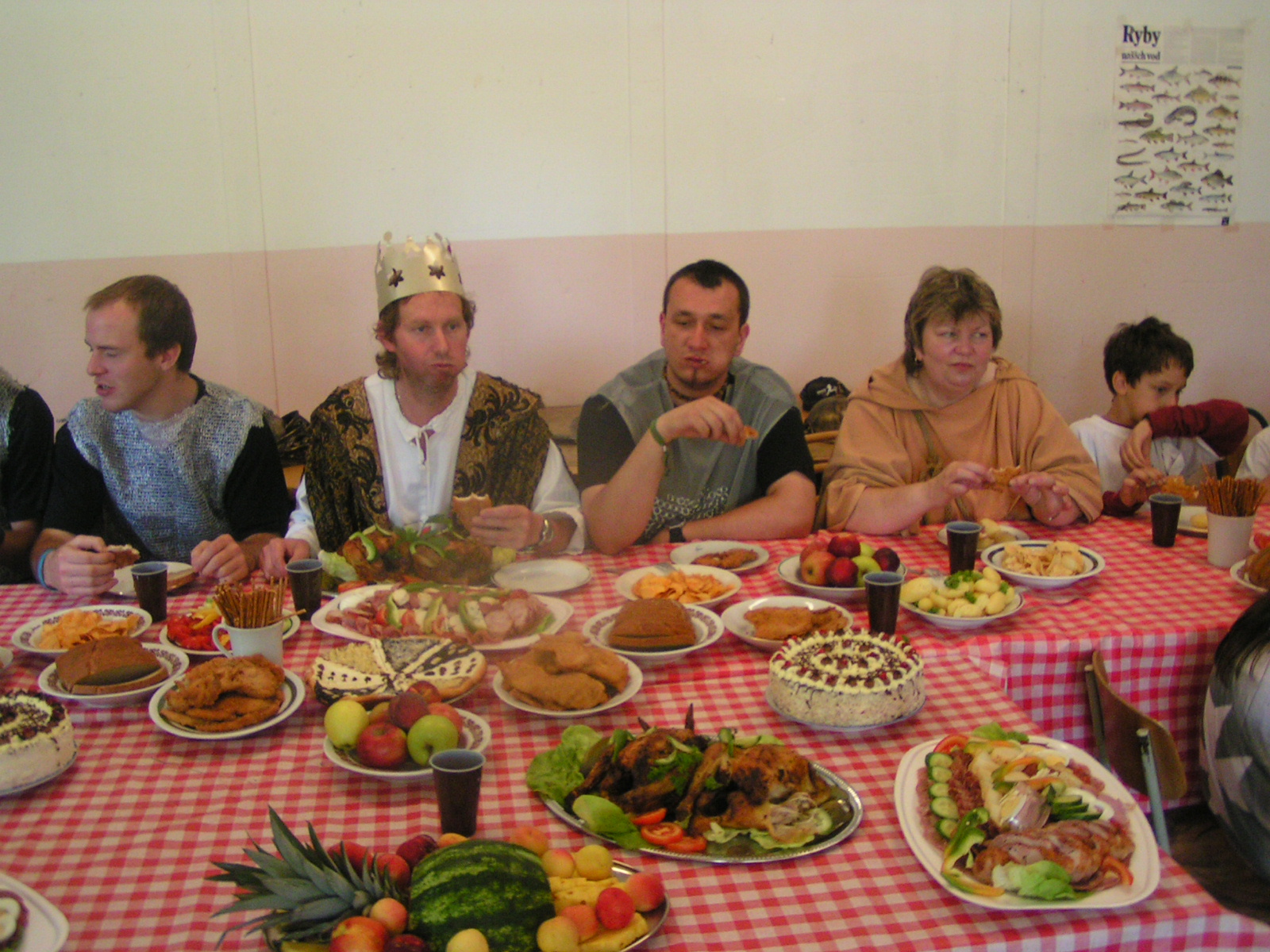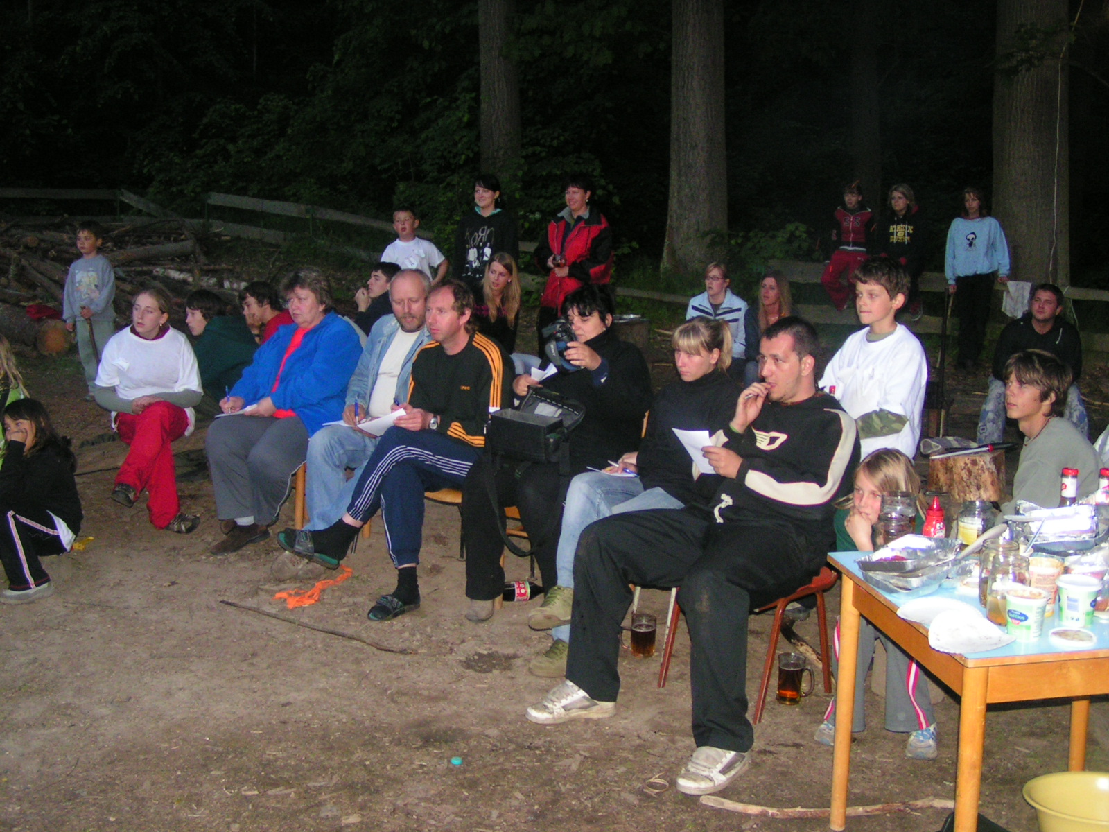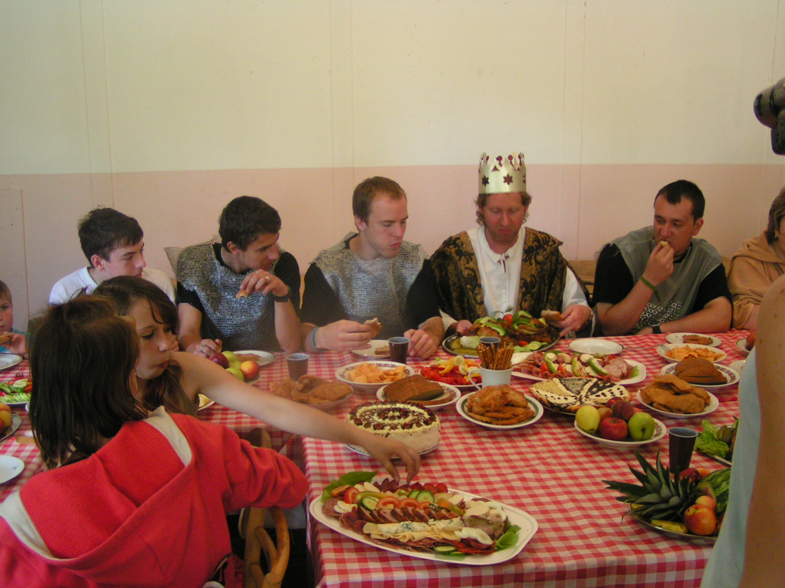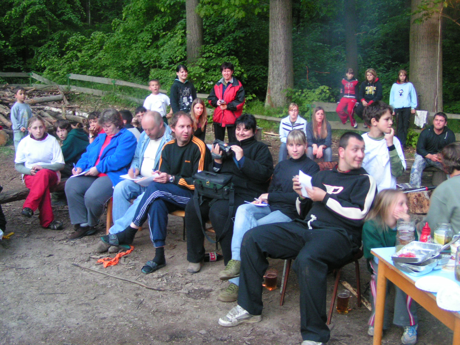 buřty, párky, klobásy - vlastní - nad ohněm rohlíky se sýrem a čajem polévka (vývar s nudlemi), guláš s knedlíkem vepřová krkovice nad plamenem, chléb buchty, chléb s paštikou a kakao královská hostina |