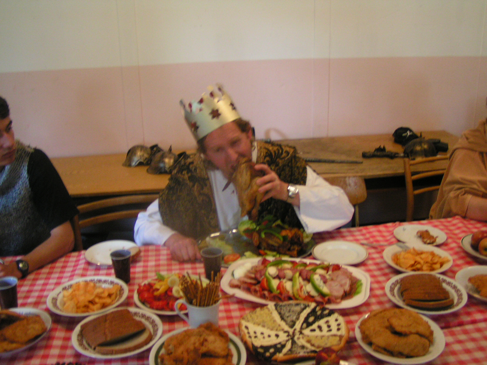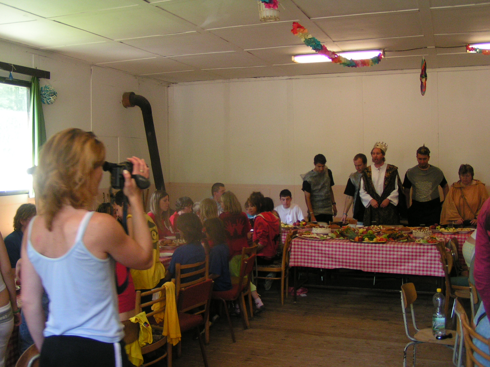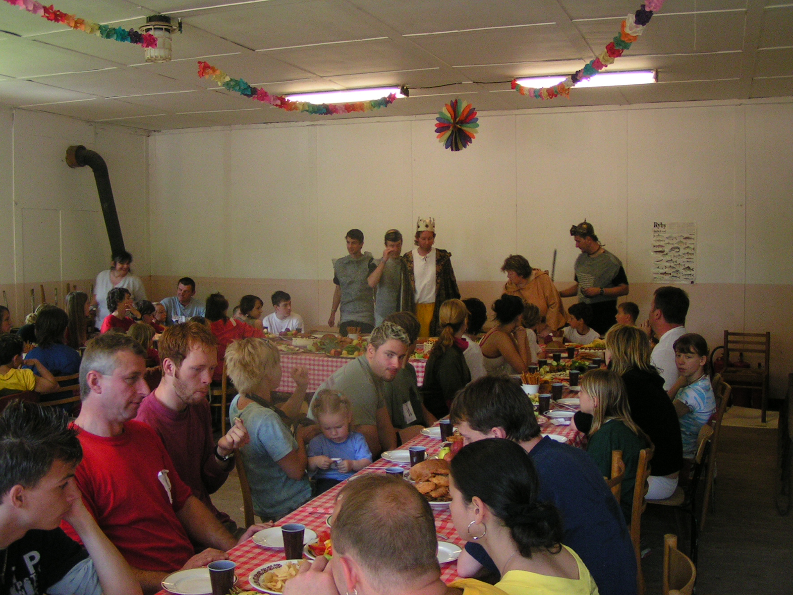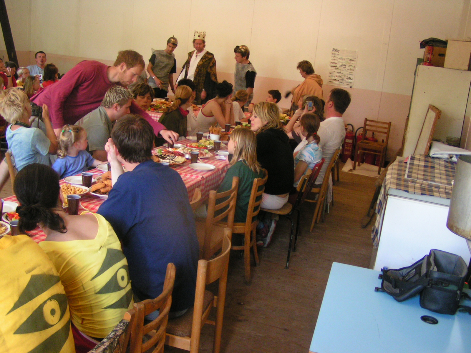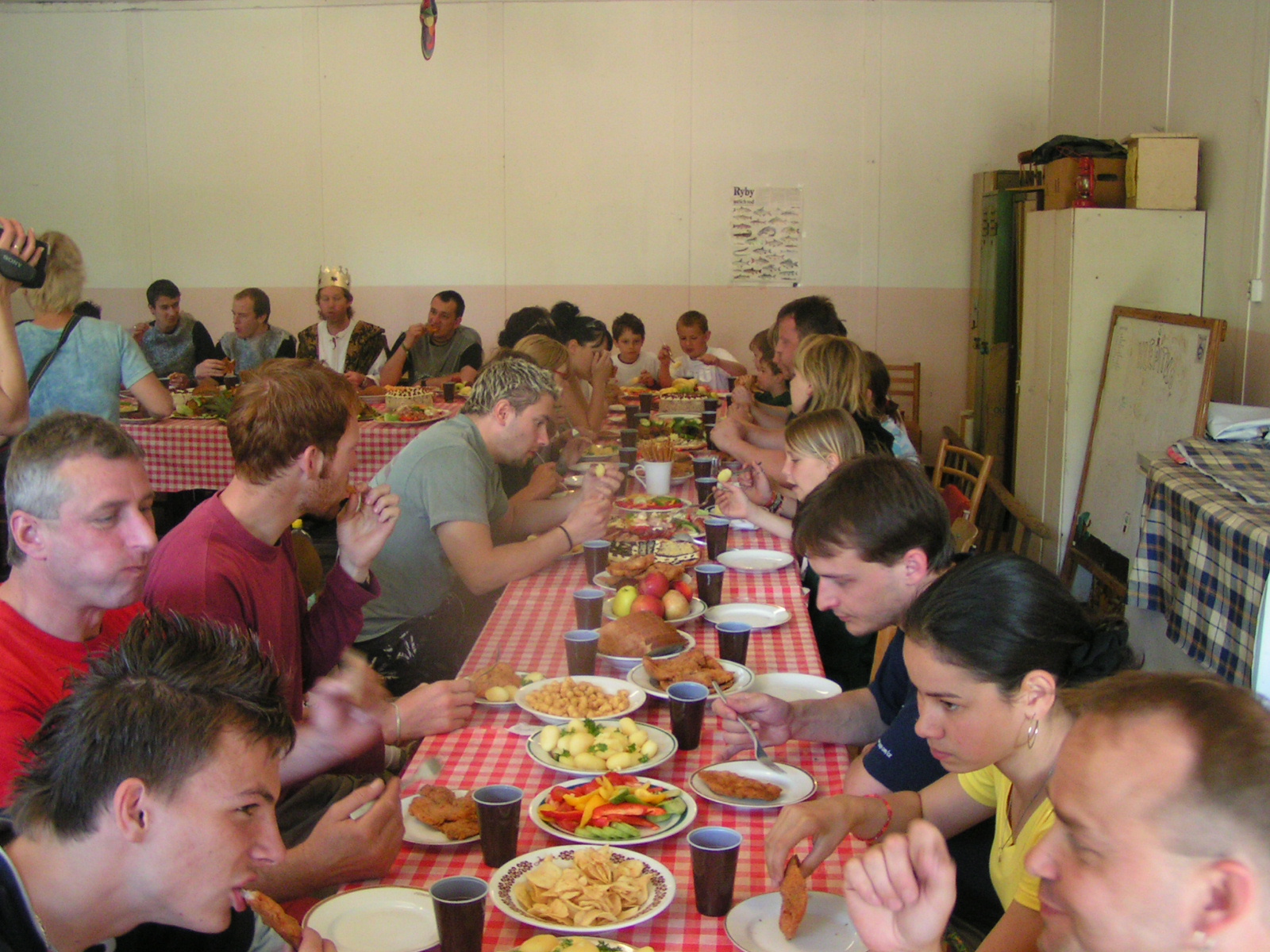 buřty, párky, klobásy - vlastní - nad ohněm rohlíky se sýrem a čajem polévka (vývar s nudlemi), guláš s knedlíkem vepřová krkovice nad plamenem, chléb buchty, chléb s paštikou a kakao královská hostina |